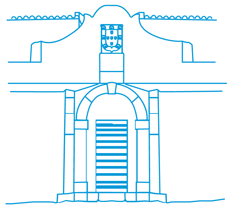 The façades are topped by merlons with prominent strings in insular masonry; the façade faces the ground with a portal in a rigid stonework with a perfect back arch, topped by baroque pediment. In this pediment is inscribed a commemorative tombstone of the foundation of the fort surmounted by the national arms, all in regional stonework.